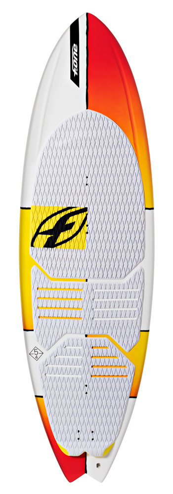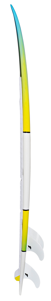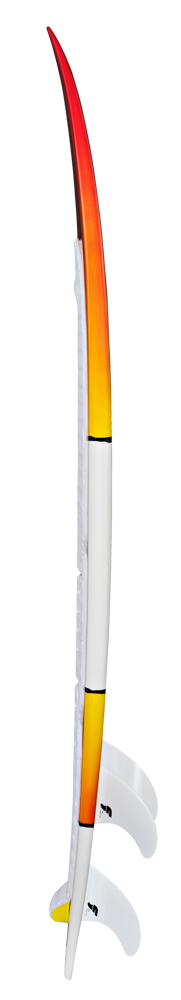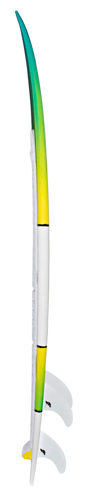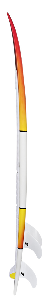 Looking at the bottom, we have used a very deep single concave that extends all the way back to the fins. This guarantees an early planning with sharp accelerations on and off the surf while helping out dealing with the chop. The two smaller sizes, 5’4 and 5’6 benefit from a bit more rocker on the tail to achieve more maneuverability and control, especially in the surf. On the two larger sizes, 5’8 and 5’10, the concave has been reduced slightly around the fins to make the board easier and more progressive in the turns and while carving.