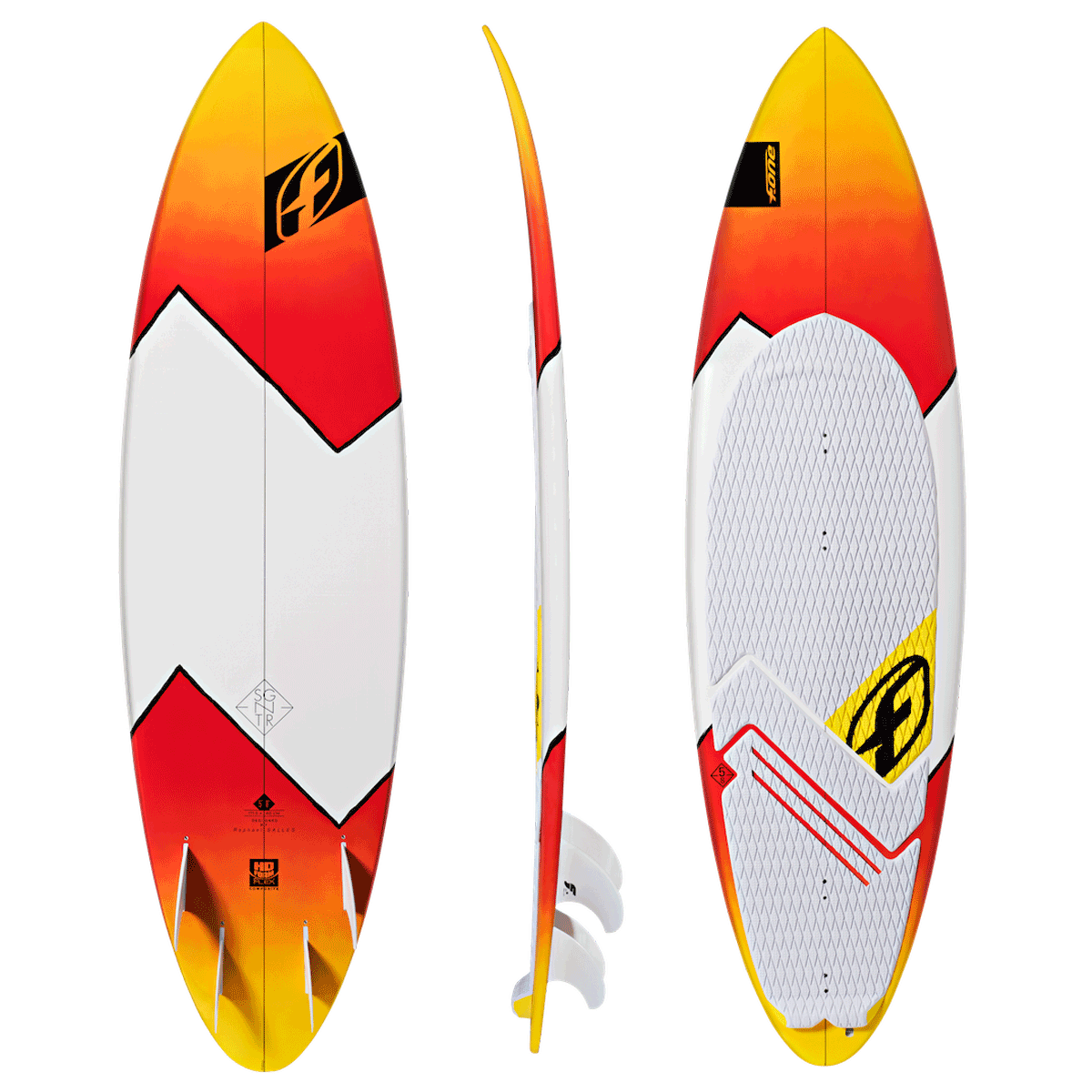 The Signature series of boards have been in the F-One line up for a few years now. These carving machines are the favorite piece of hardware for Raphael Salles to go and shred the waves. While the Mitu Pro Model might catch the limelight, the Signature should not be overlooked. Built using the new HD Foam Composite technology the board offers great flex while being exceedingly strong too. A quad fin set up delivers plenty of drive both upwind and when carving on the wave and new for this year is an improved rocker line and a new bottom shape that sees a concave at the front develop into a V at the rear. The board also features the Camel Deck, which allows better contact with your foot and a heel shock absorber to keep things comfortable.