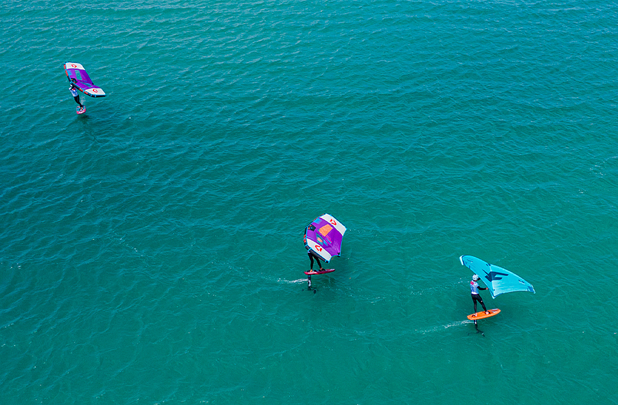 Most of our riders had never crossed a starting line before this event, but what a great experience it was for them! The Surf Race has been thought to break the rules of regular sailing racing tracks. The riders cross the starting line and go to a first buoy where they have to stop using the wing as a way of propulsion. In these particular Leucate conditions, they had to put the wing in hover mode and pump with their legs all the way to the next buoy. One jibe later and they have to go back upwind to the following buoy and cross the finish line.