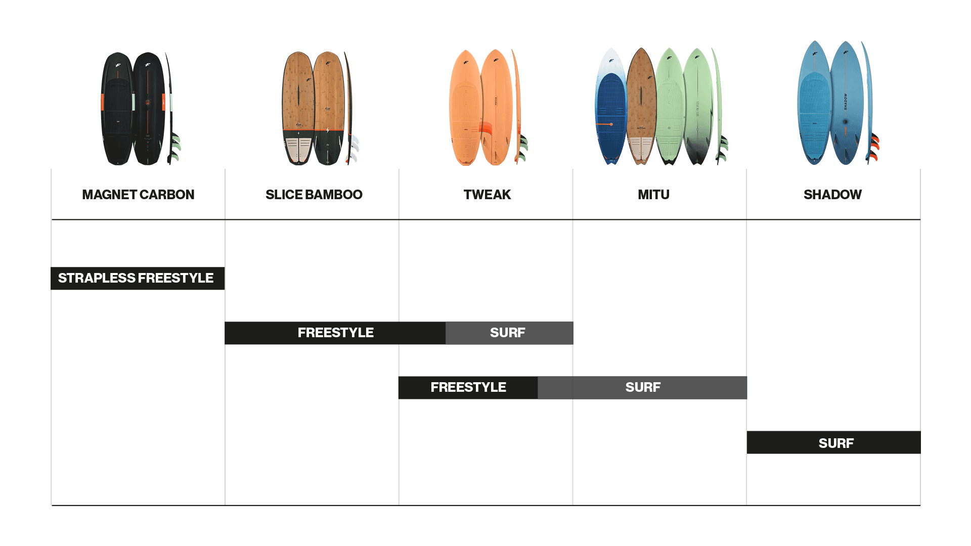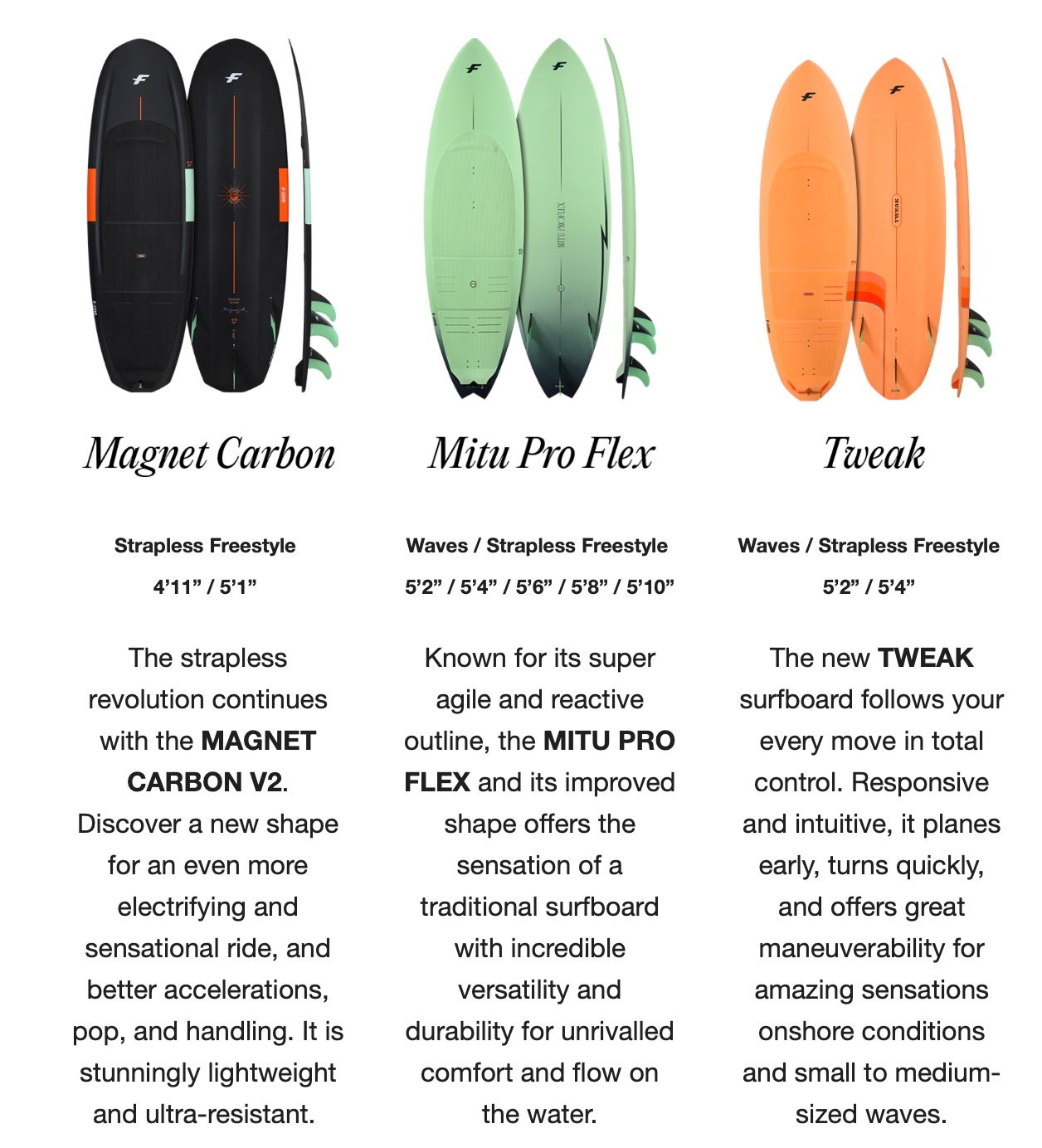 The TWEAK makes its first appearance in our range this year, while the revolutionary MAGNET CARBON and the legendary MITU PRO FLEX have been improved for even more performance and fun on the water.